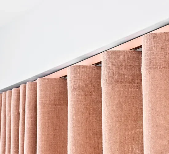 De wave-plooi geeft een strak en symmetrisch effect. De stof hangt in gelijkmatige golven over een speciale rail, wat zorgt voor een rustige en moderne uitstraling. Dit type plooi komt het best tot zijn recht bij soepel vallende stoffen en bij gordijnen die van plafond tot vloer reiken, bijvoorbeeld in een strakke leefruimte of moderne slaapkamer.
