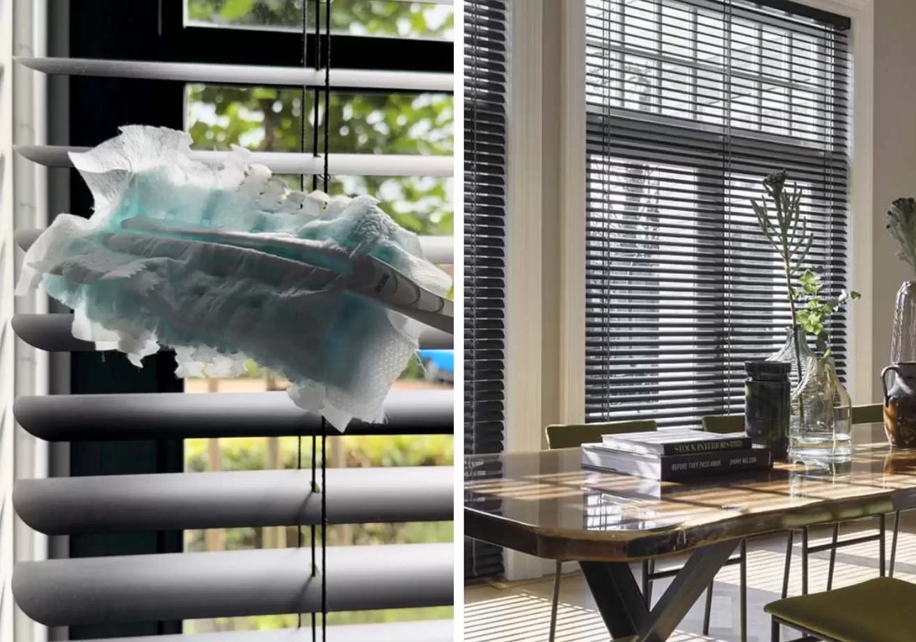 De meest snelle en eenvoudige manier om je jaloezieën, rolgordijn, Duette® shades of Plissé shades weer stofvrij te maken, is met een plumeau of door het stof eraf te zuigen met de zachte, ronde borstel van je stofzuiger. Bij lichte vervuiling kun je de raambekleding afnemen met een schone, vochtige doek of zachte spons. Bij houten jaloezieën kun je gebruikmaken van een speciale jaloeziereiniger of Swiffer Duster. Een andere slimme manier om je jaloezieën te poetsen is met een vleestang waar je microvezeldoekjes met elastiekjes omheen bindt. Op deze manier kun je de lamel aan twee kanten tegelijk schoonmaken en ben je een stuk sneller klaar.